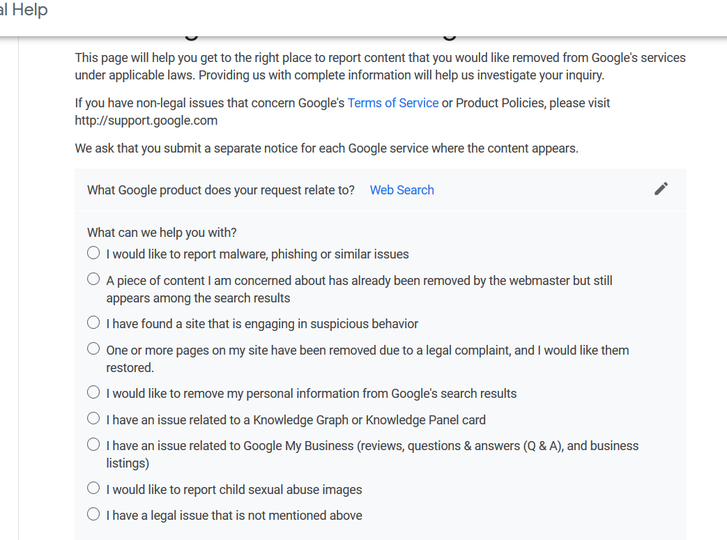 Removing Content from Google is a pretty simple process and could be accomplished by anyone. As you can see in the screenshot above, there is a wizard form (application) that asking about the type of infringement. Bad thing is, once sent, it automatically removes your website's page from the search engine result, till you prove your innocence.